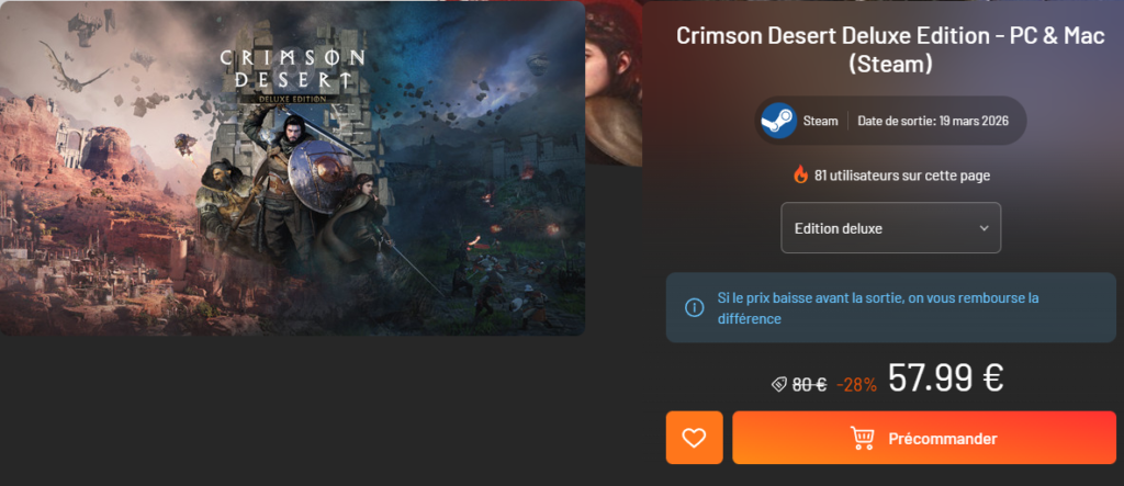 Crimson Desert est disponible en plusieurs éditions, de la version Standard à la Deluxe et à la Collector, chacune offrant divers bonus numériques ou physiques. Les précommandes sont ouvertes sur Steam et auprès des revendeurs partenaires avec des contenus exclusifs selon l’édition choisie.